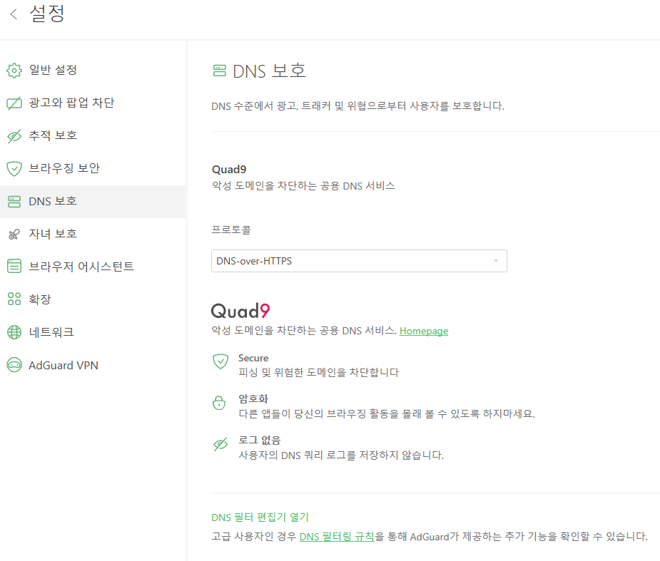Adguard 설정 - DNS 보호 메뉴에서 다양한 DNS 서버를 설정할 수 있습니다. Adguard에서는 Quad9도 기본으로 설정할 수 있습니다. 별도의 서버 IP 입력 없이 원하는 DNS를 선택하여 사용하시면 됩니다.