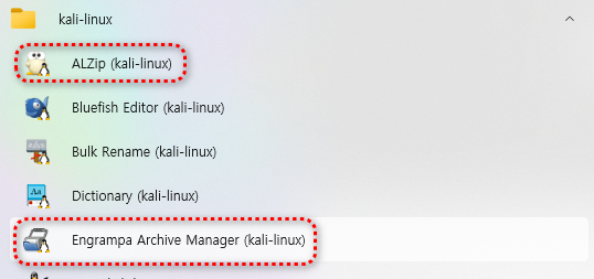 Wsl2 Kali Linux에 기본적으로 AlZip과 Engrampa Archive Manager 2개의 압축 프로그램을 사용하고 있는데, 파일 및 폴더의 이름이 모두 영문인 경우 Engrampa Archive Manager를 사용하여 압축하고, 한글이 포함된 경우에는 ALZip 프로그램을 사용하여 압축을 합니다.
