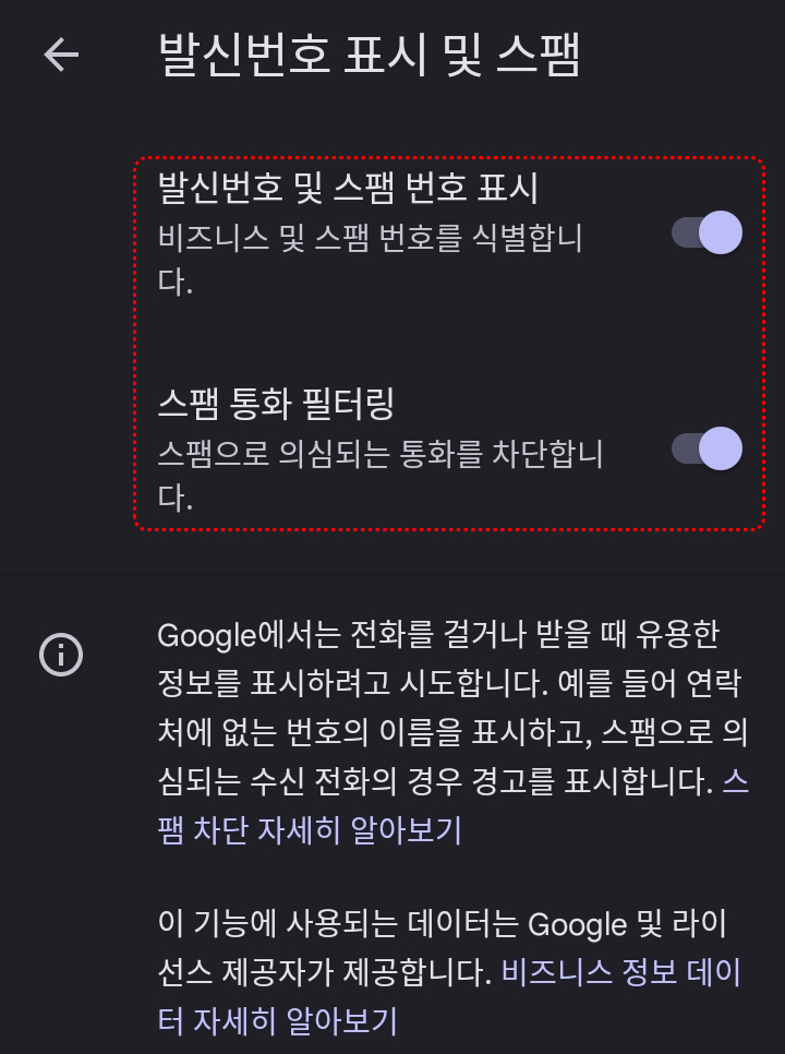 전화 앱 - 설정 - 발신번호 표시 및 스팸 메뉴에서 발신번호 표시 및 스팸 번호 표시와 스팸 통화 필터링을 모두 활성화시킵니다.