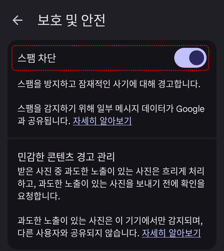 다음으로 메시지 앱에서 - 설정 - 메시지 설정 - 보호 및 안전 - 스팸 차단을 활성화시켜줍니다.