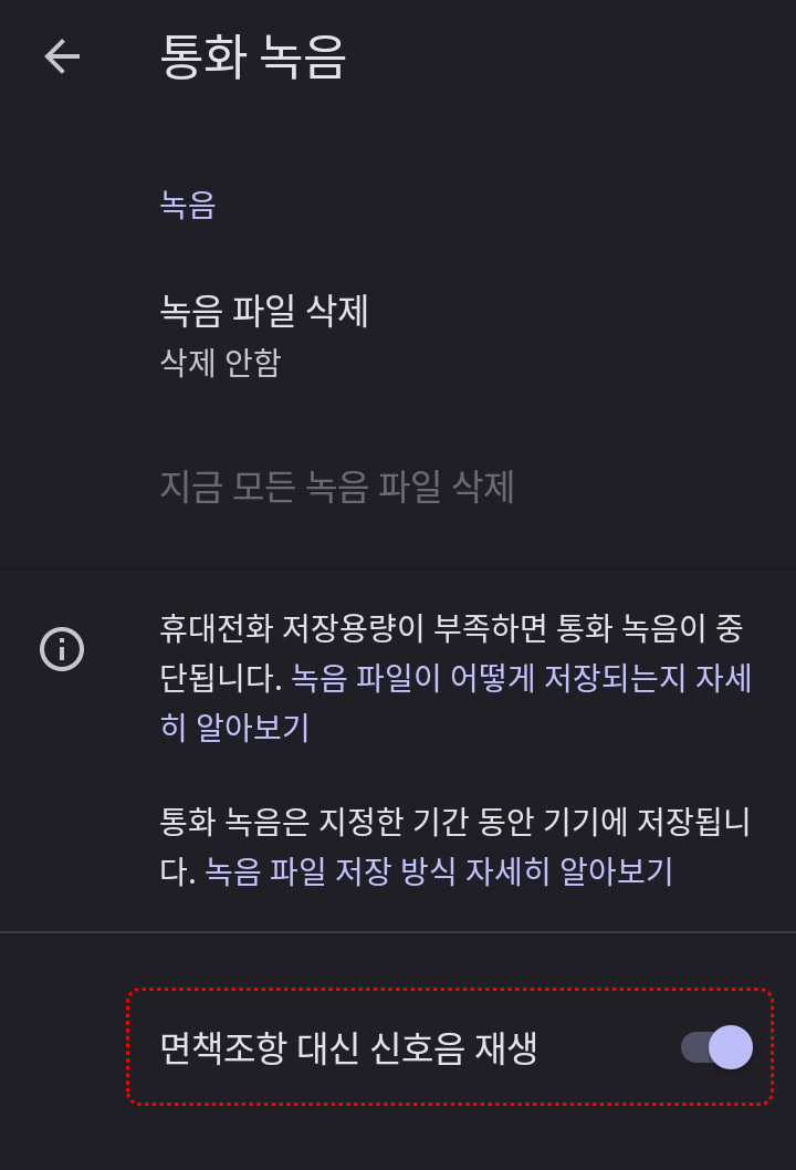 통화 녹음이 진행된다는 안내 메시지가 나오는데, 이 안내 메시지는 설정 - 통화 녹음 - 면책조항 대신 신호음 재생을 활성화시켜주시면 안내 메시지 대신 삐~ 소리로 대체됩니다.