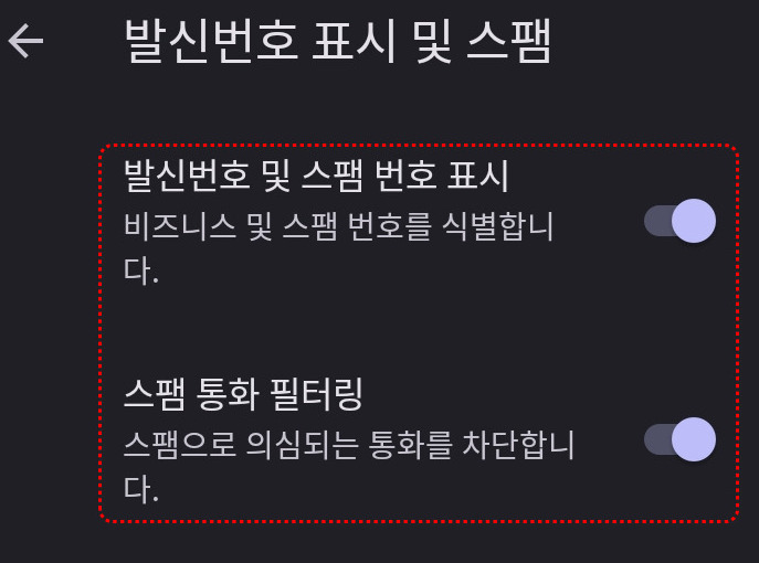 구글 전화 앱 - [설정] - [발신번호 표시 및 스팸] - [발신번호 및 스팸 번호 표시], [스팸 통화 필터링]을 활성화시켜줍니다. 발신번호 및 스팸 번호 표시는 기본 활성화이며 스팸 통화 필터링은 추가로 활성화시켜주셔야 합니다.