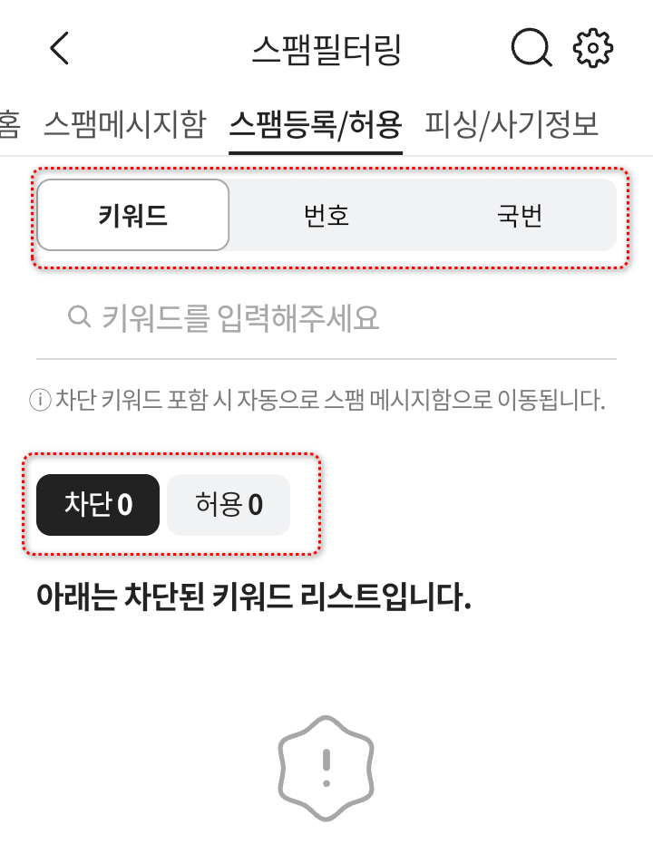 스팸 등록/허용 메뉴에서는 키워드, 번호, 국번을 각각 차단하거나 허용할 수 있습니다. 단어를 차단하기 위해서는 키워드, 번호 패턴으로 차단하시려면 국번 메뉴를 선택하고, 아래쪽에 차단을 선택하여 규칙을 등록하시면 됩니다.