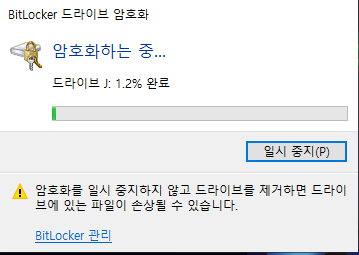 사용하던 드라이브를 전체 암호화 시키는 경우, 상당한 시간이 소요됩니다. 참고하세요.