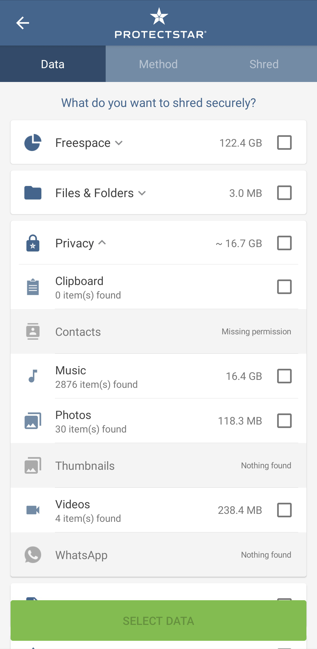 유료 버전에서는 Files&Folders, Privacy 메뉴를 통해서 종류별로 선택하여 삭제할 수 있습니다. 휴대전화 데이터 구조를 잘 아는 사용자의 경우, "File Explorer" 기능을 통해 직접 자료가 있는 디렉터리로 이용해서 삭제할 수 있습니다.